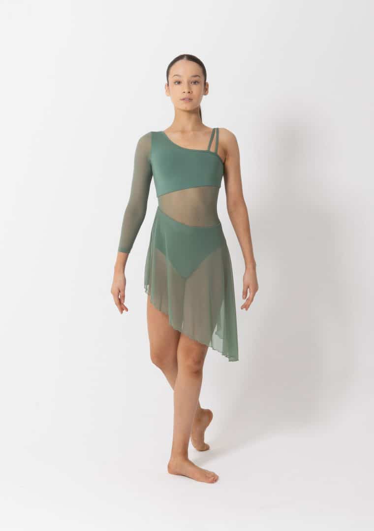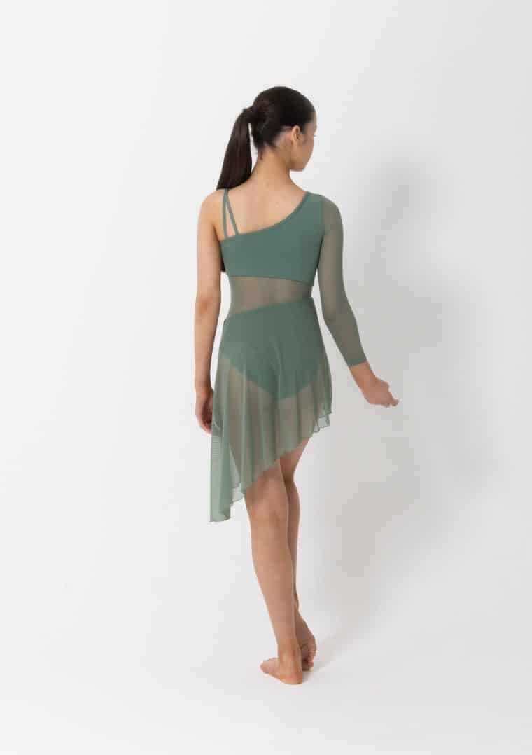 Embrace the natural elegance and flow in the Tasha Lyrical Dress. Perfect for lyrical and contemporary styles, this dress features a striking asymmetrical design to enhance your performance. A single long mesh sleeve offers graceful coverage on one arm, while the opposite side showcases an elegant double-strap detail. The asymmetry continues through the skirt, where soft mesh drapes diagonally for beautiful movement that mirrors your choreography.