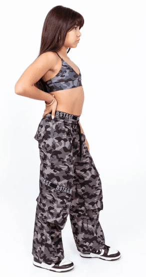Unique stretch parachute fabric that supports movement and guards against back tearing during squats and intense choreography.